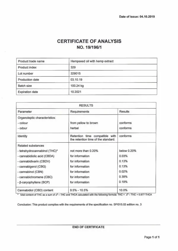 Our CBD OIL 10% contains the full spectrum of cannabinoids, flavonoids and terpenoids naturally occurring in cannabis (incl. CBC – cannabichromene, CBG – cannabigerol, CBDV – cannabidivarin, BCP – ß-caryophyllene).